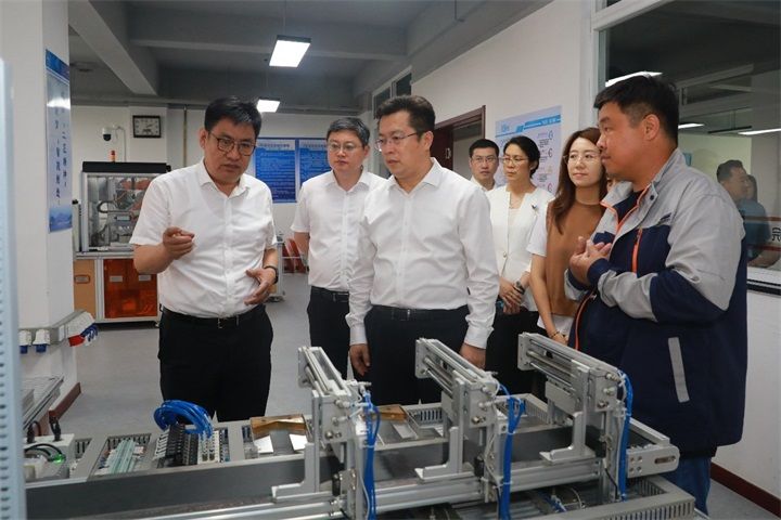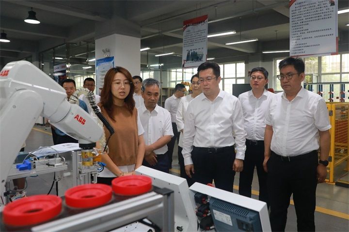 王庆东厅长实地考察了学校工业机器人技术综合实训中心、机器人系统集成实训室、运动控制技术实训室、生产线自动化技术实训室、中法施耐德产教融合实训基地,听取了学校办学情况、育人特色、实训基地建设等情况汇报,详细了解了学校在夯实立德树人基础、加强校企深度融合、推进教育教学改革等方面的具体举措。