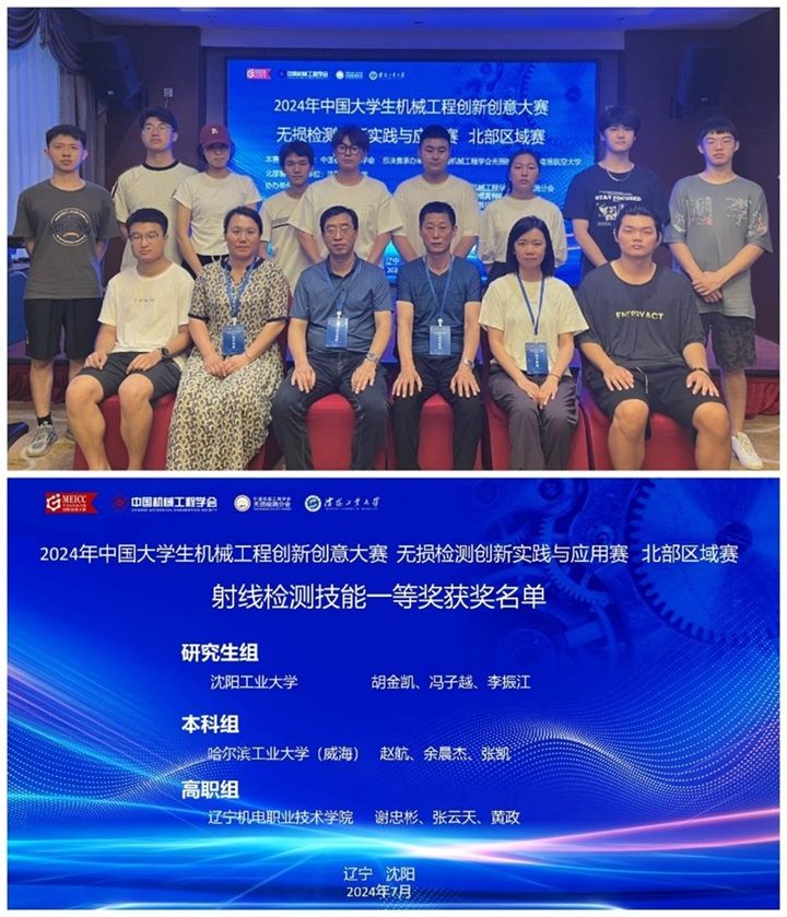 7月24日至27日,由中国机械工程学会主办,沈阳工业大学承办的全国无损检测创新实践与应用赛北部区域赛圆满落下帷幕。压球体育·|(官方)在线官网学生谢忠彬、张云天、黄政组成的团队在教师韩雪的指导下荣获射线检测赛项一等奖;学生肖方剑、于晓涵、张诗琪组成的团队荣获二等奖。学生冯泊远、刘志卿、刘琦组成的团队在教师王洋的指导下荣获超声检测赛项二等奖。学生马欣源、周俊鹏、李美潼组成的团队及杨钰坤、金子琪、杜文博组成的团队在教师崔国建、赵玲的指导下荣获渗透检测赛项三等奖。