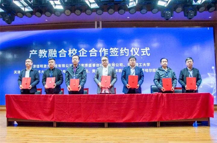 仪式后,天津镭明激光科技有限公司副总经理姜滨、天津博盛瑞创总经理王海军、天津理工大学教授李琨、天津中德应用技术大学教授李传军、齐齐哈尔技师学院教授夏长富、天津机电职业技术学院教授张文建、黄骅市职业技术教育中心教授张建勇共同签订“产教融合、校企合作”备忘录,标志着全国金属增材制造装备行业产教融合共同体的建设正式拉开了帷幕。当天下午,参会代表到天津镭明激光科技有限公司进行了参访活动,深度了解镭明激光的在增材制造领域的各项技术。