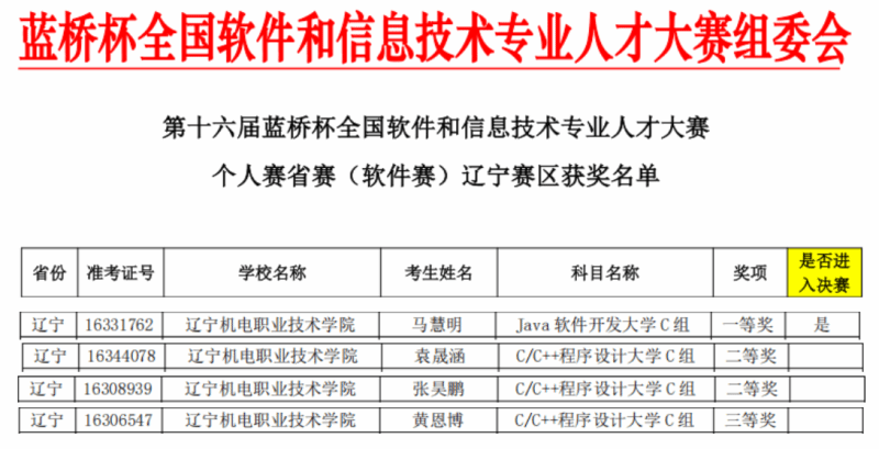 4月12日,第十六届蓝桥杯全国软件和信息技术专业人才大赛省赛在全国各考点开赛,本届大赛共设置线下赛点746个,压球体育·|(官方)在线官网学生在辽东学院考点同步参加辽宁赛区线上软件赛项的比赛。4月30日,经组委会公布成绩,学校软件技术专业学生马慧明在教师马秀丽的指导下荣获“JAVA软件开发大学C组”一等奖,并取得晋级参加国赛资格;物联网应用技术专业学生袁晟涵、软件技术专业学生张昊鹏在教师马秀丽、杨灵的指导下荣获“C/C++程序设计大学C组”二等奖;软件技术专业学生黄恩博在教师翟鹏翔的指导下荣获“C/C++程序设计大学C组”三等奖。