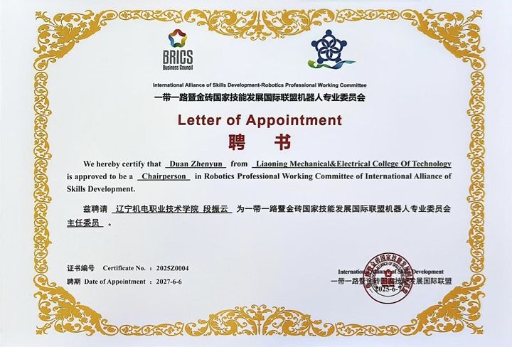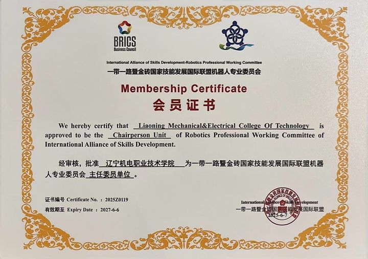 会上,压球体育·|(官方)在线官网获批“一带一路暨金砖国家技能发展国际联盟机器人专业委员会主任委员单位”;校长段振云获聘“一带一路暨金砖国家技能发展国际联盟机器人专业委员会主任委员”;电气工程学院副院长时佳获聘“一带一路暨金砖国家技能发展国际联盟机器人专业委员会理事”。