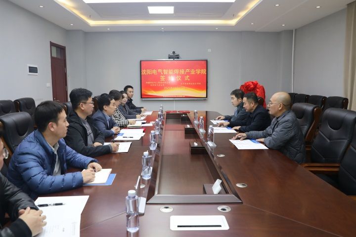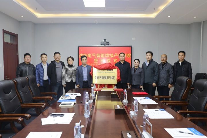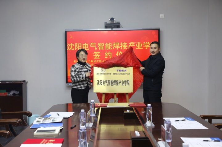 王岩与李新祖代表校企双方签署共建“沈阳电气智能焊接产业学院”合作协议,并揭牌。