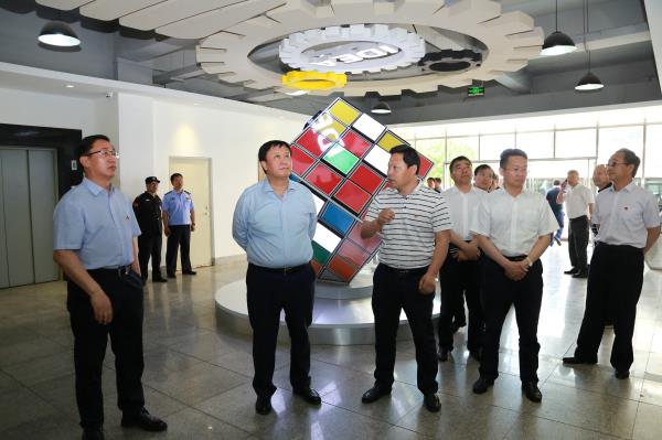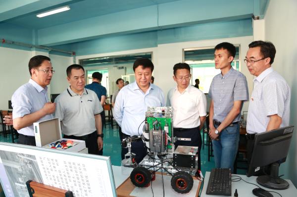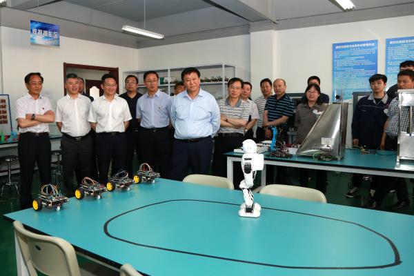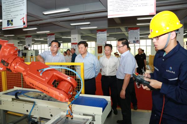 唐国华一行视察了我院校园文化长廊、图书馆、学生食堂,并深入大学生宿舍与学生交流,重点视察了学院智能制造生产性实训基地、创新创业学院、机器人创新实践中心、柔性制造创新实训中心和智能检测技术、自动化技术、虚拟仪器技术等3个校企协同创新中心,并与现场的师生进行了亲切的交流。唐国华对学院近年来的高质量发展给予了肯定,对学院发展定位给予了高度评价,对学院力争“双高”的全院教职工的干劲给予了高度的赞扬。