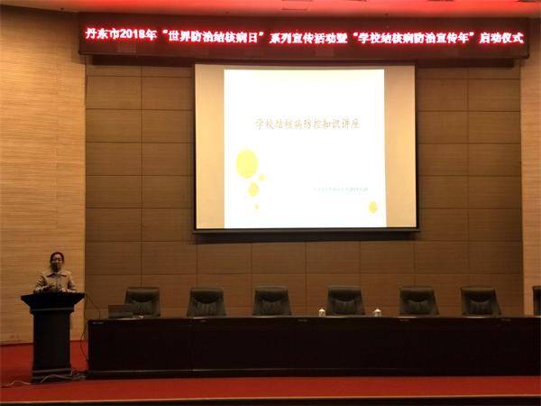 活动开始,丹东市结核病防治所所长王福刚向师生们介绍了本次活动的目的意义。接着,丹东市结核病防治所城防科科长王轶欧做了学校结核病防治知识讲座,就结核病的特征、预防和控制、学校结核病日常管理及应急处置等方面作了详细讲解,并为师生们播放防治宣传片。活动最后,现场发展了志愿者,鼓励青年志愿者积极参与结核病防治知识的传播。
