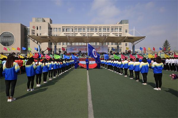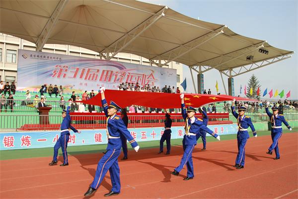 5月10日上午7:15分,入场式正式开始,各方队着装整齐,精神抖擞,喊着响亮的口号通过主席台。主席台上学院党委书记王忠诚,党委副书记陈秋鹏、副院长赵景晖、副院长佟海军等党政领导及辽宁中金欧亚珠宝集团党委副书记张昌富、辽宁曙光汽车集团股份有限公司代表曲壮、丹东华孚集团党总支书记王丹丹检阅了各方队并观看表演方队演出。