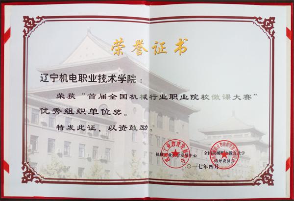 2017年4月9日,由全国机械职业教育教学指导委员会和机械工业教育发展中心联合主办的首届全国机械行业职业院校微课大赛于江苏常州落下帷幕。本次大赛共收到来自全国各职业院校近千名教师的近千件作品。经过网上评选、专家评审、决赛答辩等环节,最终评选出高职组一等奖作品58件。在众多参赛作品中,我院报送的15件作品全部获奖,我院教师共获得一等奖5项、二等奖5项、三等奖5项,网络人气奖1项,学校荣获优秀组织奖。