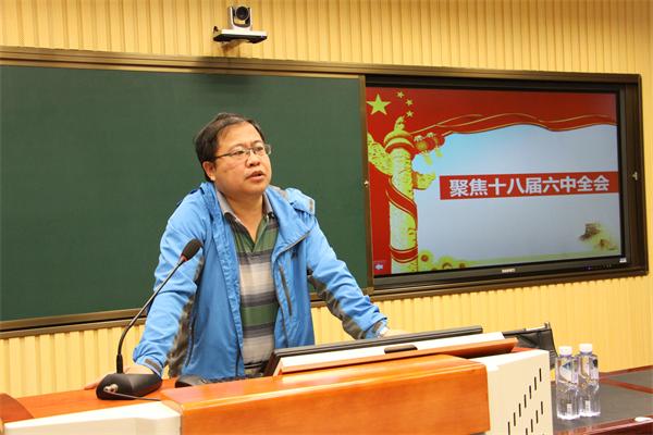 5月5日,学院思政部副教授周家兴为全体党支部书记做了题为《聚焦十八届六中全会》的专题辅导讲座,这也是党支部书记集中培训的组成部分。 周家兴从十八届六中全会召开的背景、内容和意义等方面进行了讲解,用了丰富的案例,深入探讨了全面从严治党、核心意识、严肃党内政治生活、完善党内监督责任等内容。 本次讲座是党支部书记集中培训的第二次专题辅导讲座。