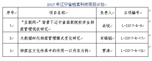 根据辽宁省档案信息网“辽宁省档案局办公室关于印发《2017年辽宁省档案科技项目计划》的通知”获悉,我院有三位教师的项目被确定为2017年辽宁省档案科技项目。 本次档案科技项目全省共获批49项,全部为自筹经费项目。3月初科研处收到消息在院内发布立项通知,3月末组织项目申报,我院此次共申报档案项目4项。