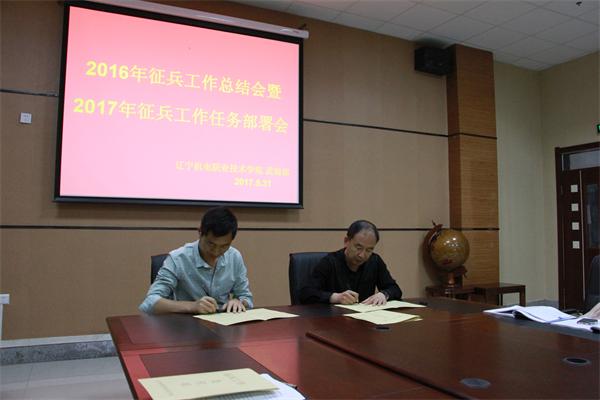 会议第三项由党委副书记、武装部长陈秋鹏与各院系签订2017年征兵工作责任状。