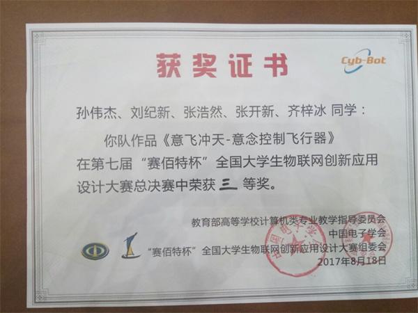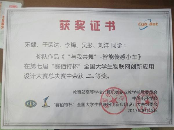 第七届全国大学生物联网创新应用设计大赛于2017年8月17日在北京举行,本次大赛由教育部高等学校计算机类专业教学指导委员会主办,中国电子学会、北京赛佰特科技有限公司承办。我院信息工程系嵌入式技术与应用专业在指导教师邹士喜、庞春辉、张文博的带领下,16541班宋健、于荣达、李铎、刘洋、孙伟杰、刘纪新、张浩然、张开新、16513班吴彤、齐梓冰参加了此次竞赛,“与我共舞-智能传感小车”项目荣获二等奖、“意飞冲天-意念控制飞行器”项目荣获三等奖。