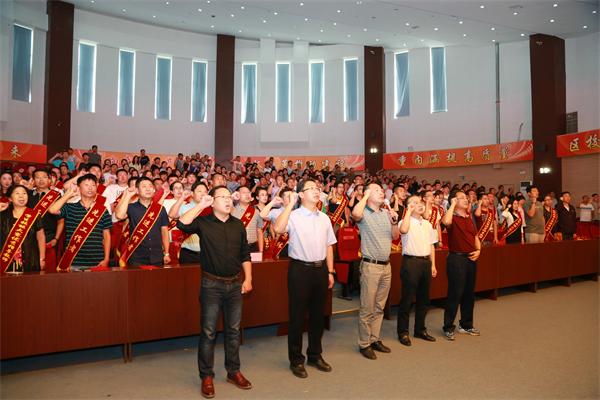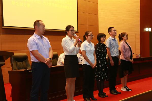 新教师自我介绍之后,他们与全院老教师一道重温教师誓词。全院教职工在院党委副书记陈秋鹏的领誓下庄严宣誓。学院通过这样一种具有仪式感的形式,使全校教职工能够时刻牢记誓言,兢兢业业、恪尽职守,从而更加爱校爱生,敬业奉献。