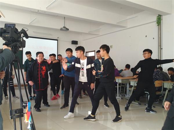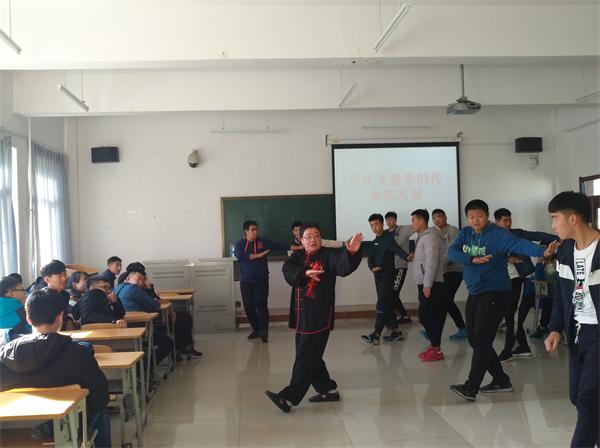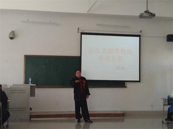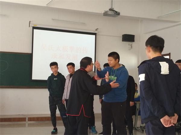 张会长从中华太极学说的起源谈起,阐释了太极的哲学思想和现实意义。同时把吴氏太极拳的发展和特点、套路以及防身自卫的方式都进行了有针对性的介绍,同学们听得津津有味。同时,张社长还现场为同学们演示了慢拳和快拳套路,并请同学们现场体验和学习拳式。几个学习过太极拳的同学还不断向张社长请教各式各样的问题,张社长都毫不保留的进行指导和讲解,整个现场气氛十分热烈、掌声不断。