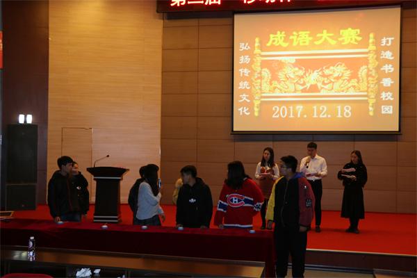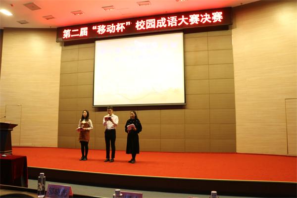 2017年12月18日14时50分,第二届“移动杯”校园成语大赛决赛在大学生素质教育中心四楼报告厅隆重举行。本次决赛的评委有:学院工会副主席邬晓光、基础部主任陈博、图书馆馆长聂国山,移动公司代表刘丽丽女士,主持人由学院广播电台孙祥淇、许栖桐、辛茹三名同学担任。