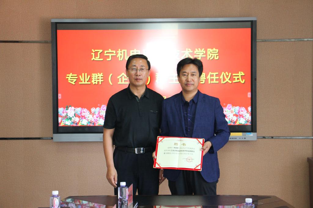 党委书记王忠诚为工业过程自动化技术专业群(企业)群主任李祖军颁发聘书