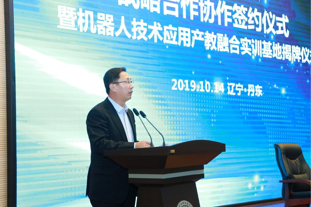 学院党委书记王忠诚教授在致辞中表示,新松公司是中国机器人领军企业,学院与新松公司确定战略合作关系,是校企双方贯彻落实国家关于深化产教融合、校企合作的重大举措,更是学院坚定前行在“区校企联动发展,产学研结合办学”特色发展之路上的又一重大里程碑。学院将以此次仪式为契机,与新松公司紧密合作,致力于在共建产教融合实训基地、人才培养基地和产学研平台等方面积极作为,促进校企双方在人才培养、技术应用、社会服务、产教融合等领域真正实现互惠互利、共同发展,为新松公司智慧发展、科学发展助力,为辽宁全面振兴、全方位振兴做出新贡献!