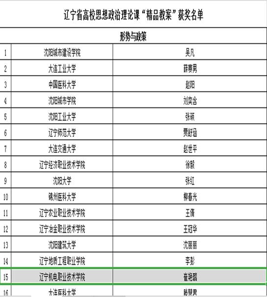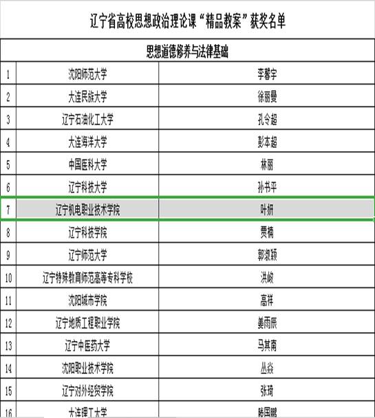 根据《辽宁省教育厅办公室关于开展辽宁省高校思政课“精品教案”评选的通知》,4月30日,辽宁省教育厅公布了全省高校思政课“精品教案”评选结果,我院思政部教师崔艳璐、叶妍分别在“形势与政策”和““思想道德修养与法律基础”课程的评比中获奖。