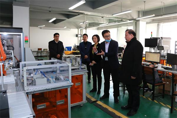 揭牌仪式后,学院领导陪同市、区领导,专家及相关工作人员现场参观了位于创新创业学院的运动控制系统开发与应用实训室、数字孪生实训室、工业机器人综合实训中心,对如何实现工业智能制造的技术突破、项目落地、人才培养等方面进行调研和走访。