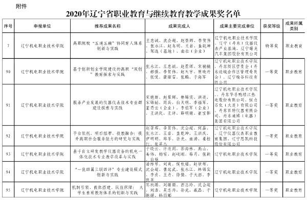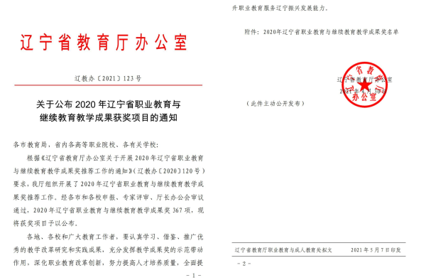 近日,2020年辽宁省职业教育与继续教育教学成果奖获奖项目通知正式下发。本次奖项共评选出全省367项职业教育与继续教育领域的优秀成果,其中,由我院推荐的7项成果全部获奖,包括特等奖1项,一等奖6项。