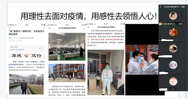 3月29日,大学生素质教育中心孙光老师通过直播平台,面向全校开展了《疫情期间大学生心理调适》主题讲座,引导学生正面“疫”境,做好心理“防疫”;4月20日,孙光老师通过腾讯会议,开展《团体心理辅导理论及应用》讲座,在云端为学生介绍团体心理辅导;5月23日,刘笑老师在线上开展《疫情心理疏导调节》讲座,向学生介绍疫情期间心理调节方法,帮助学生建立积极心态;5月25日,组织学生观看辽宁高校心理阳光大讲堂《疫情下如何提升心理免疫力》,提升学生心理健康素养,培育学生积极心理品质。
