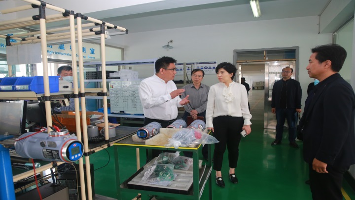 于宏国一行实地走访了企业生产车间,张一丁对研发试验设备、环境试验设备、高压试验设备、技术研发中心产业生产线等高端仪器设备进行了介绍。于宏国对公司自主研发生产的物位仪表、流量仪表等产品给予充分肯定。