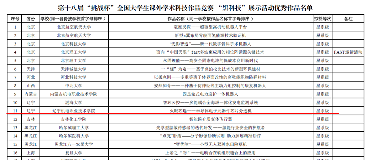 本届大赛,辽宁省共申报作品110项,由中国医科大学、东北大学、大连理工大学等11所本科和高职院校推送,获全国特等奖“星系”级作品共两项。“黑科技”专项赛是第十八届“挑战杯”全国大学生课外学术科技作品竞赛的三个专项赛事之一,赛事针对前沿领域,具有高精尖色彩,旨在进一步培养大学生科创意识和能力,促进青年大学生努力成长为科技强国建设的生力军。