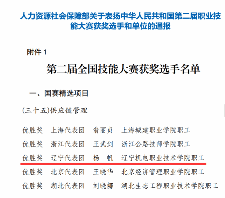 近日,人力资源社会保障部发布《关于表扬中华人民共和国第二届职业技能大赛获奖选手和单位的通报》,压球体育·|(官方)在线官网教师杨帆在教练赵东明的指导下荣获第二届全国职业技能大赛“供应链管理”赛项优胜奖。